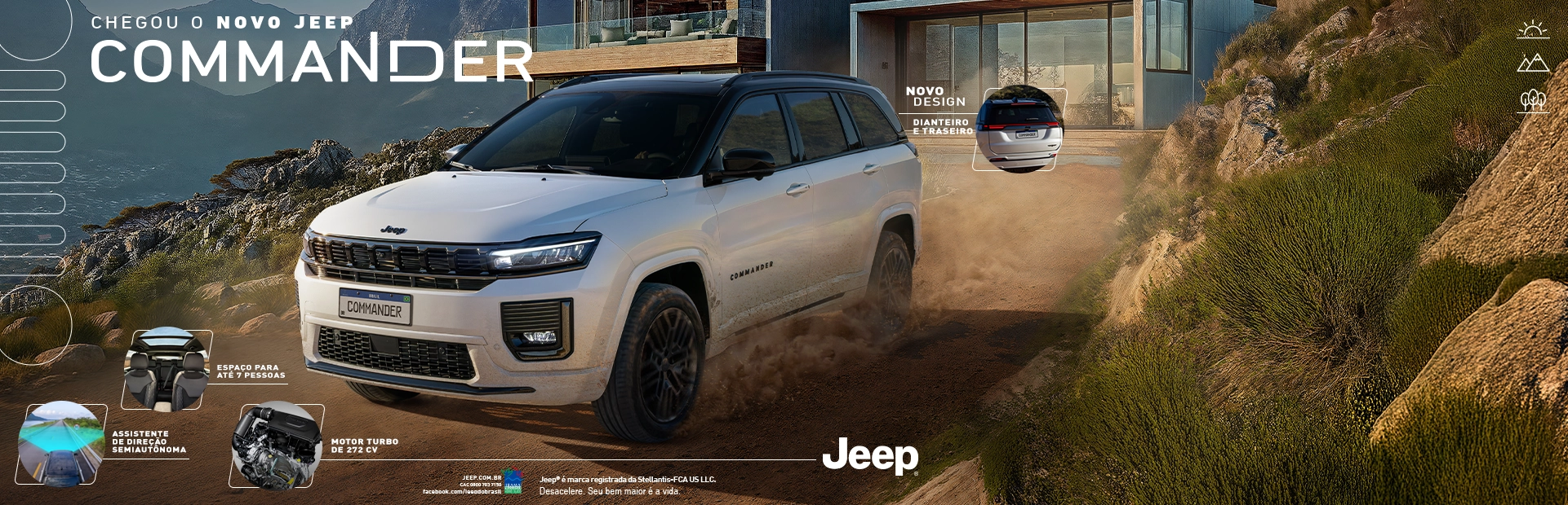 O Jeep Commander Blackhawk une sofisticação, performance e esportividade em uma versão feita para quem exige o máximo. Equipado com o motor Turbo Hurricane a gasolina, são 272 cv de potência e 400 Nm de torque, proporcionando uma aceleração de 0 a 100 km/h em apenas 7 segundos. Por fora, se impõe com acabamento escurecido, rodas exclusivas, pinças vermelhas e a cor cinza Sting Gray. Por dentro, entrega refinamento com bancos bordados, painel em suede preto e vidros escurecidos.